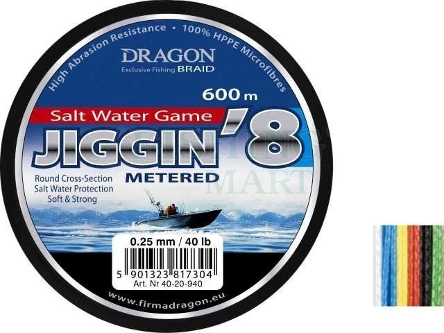 Dzięki zastosowaniu techniki ośmiosplotowej uzyskaliśmy plecionkę morską o najwyższych możliwych parametrach, doskonale okrągłą w przekroju, cienką a jednocześnie wyjątkowo mocną. Specjalne, odcinkowe barwienie na 7 jaskrawych kolorów, pozwala na precyzyjne określenie głębokości prowadzenia przynęty bez potrzeby stosowania kołowrotka z licznikiem głębokości.